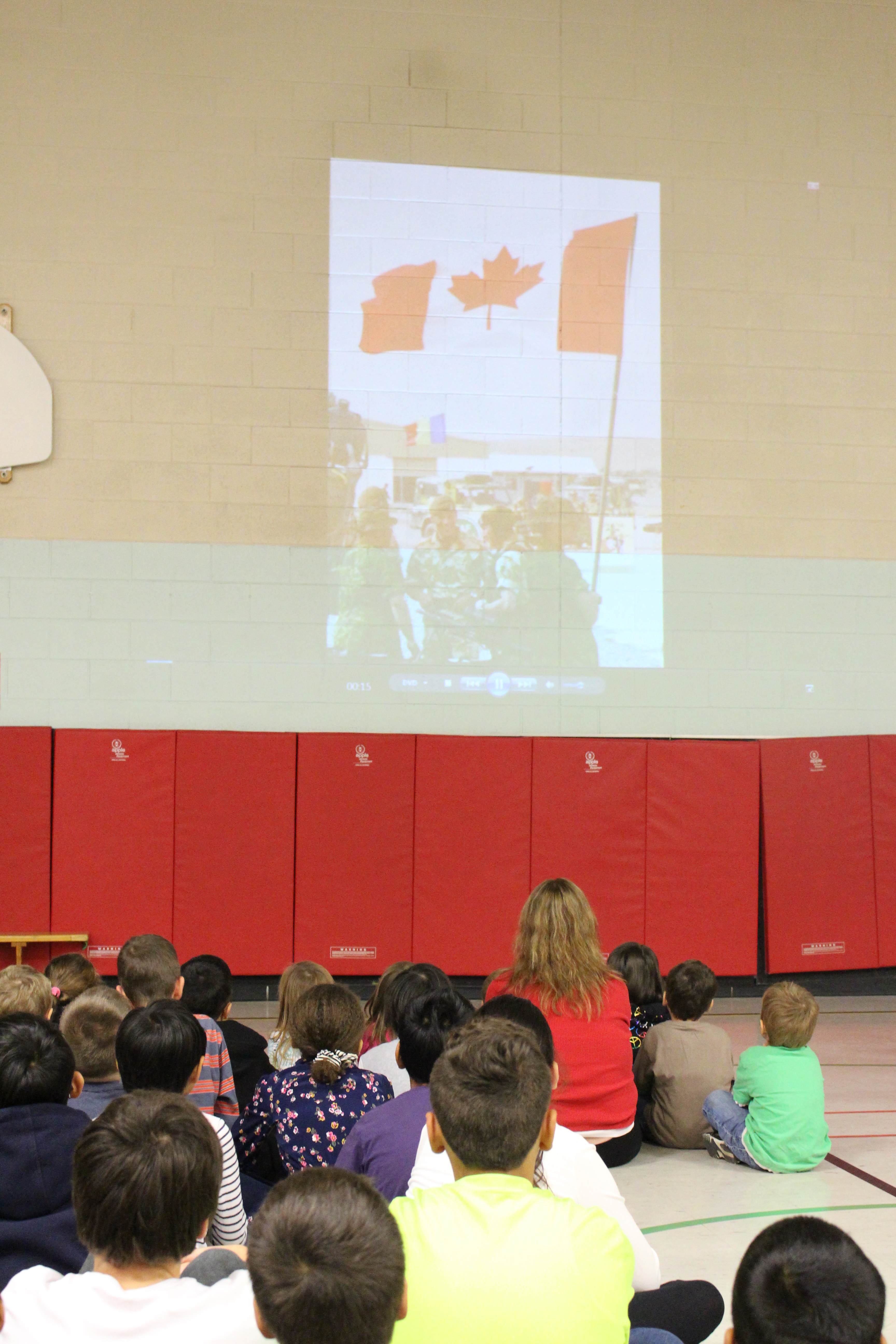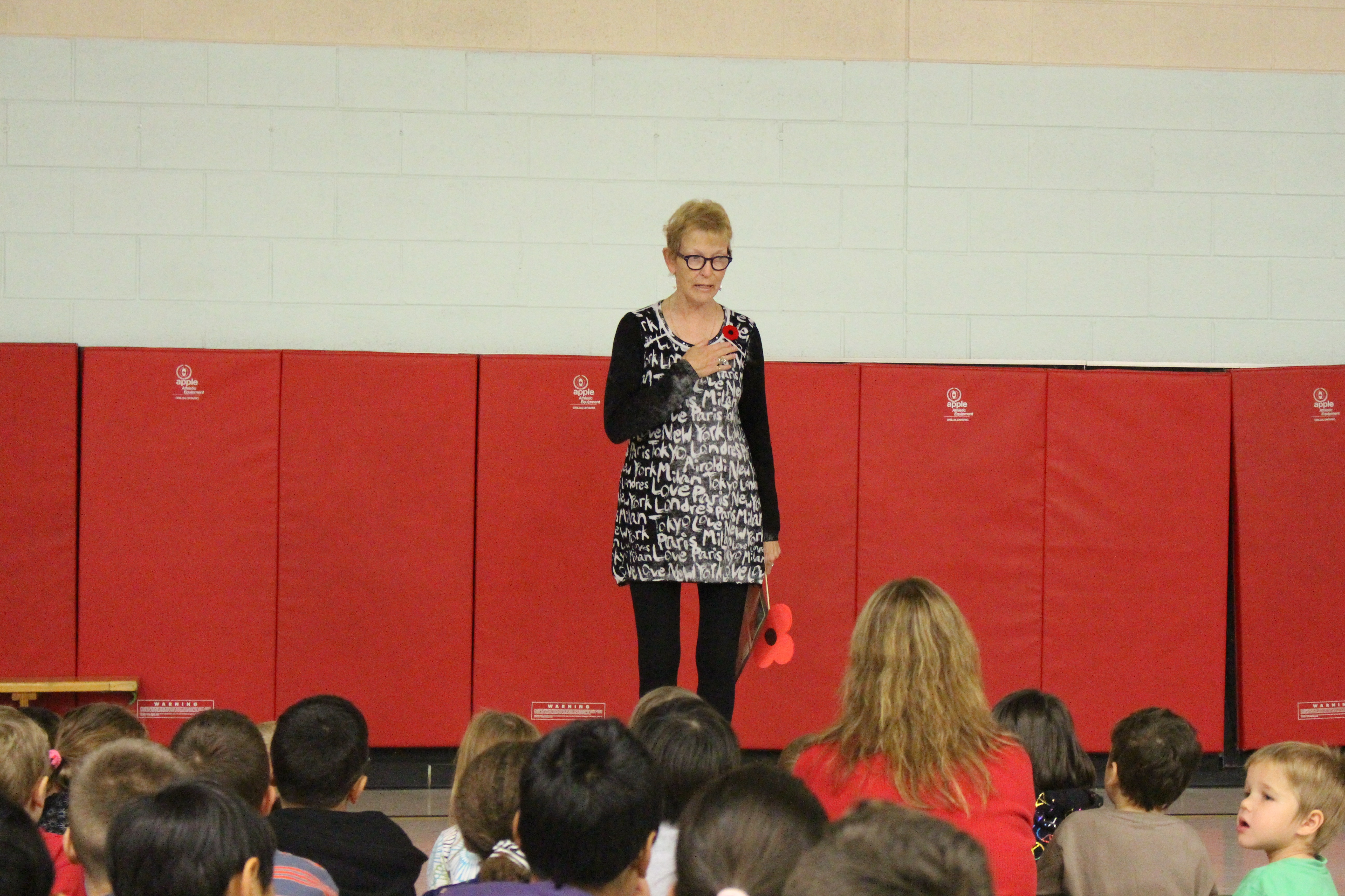 Towards the end of the assembly, a special moment took place. Easton, a Kindergarten student, walked to the front of the gym dressed in his great-great grandfather’s WWI uniform. Trying to hold back the tears, Alpine PS principal Mrs. Markanastasakis read aloud a brief story of Easton’s brave relative. Remembrance Day to him means love.