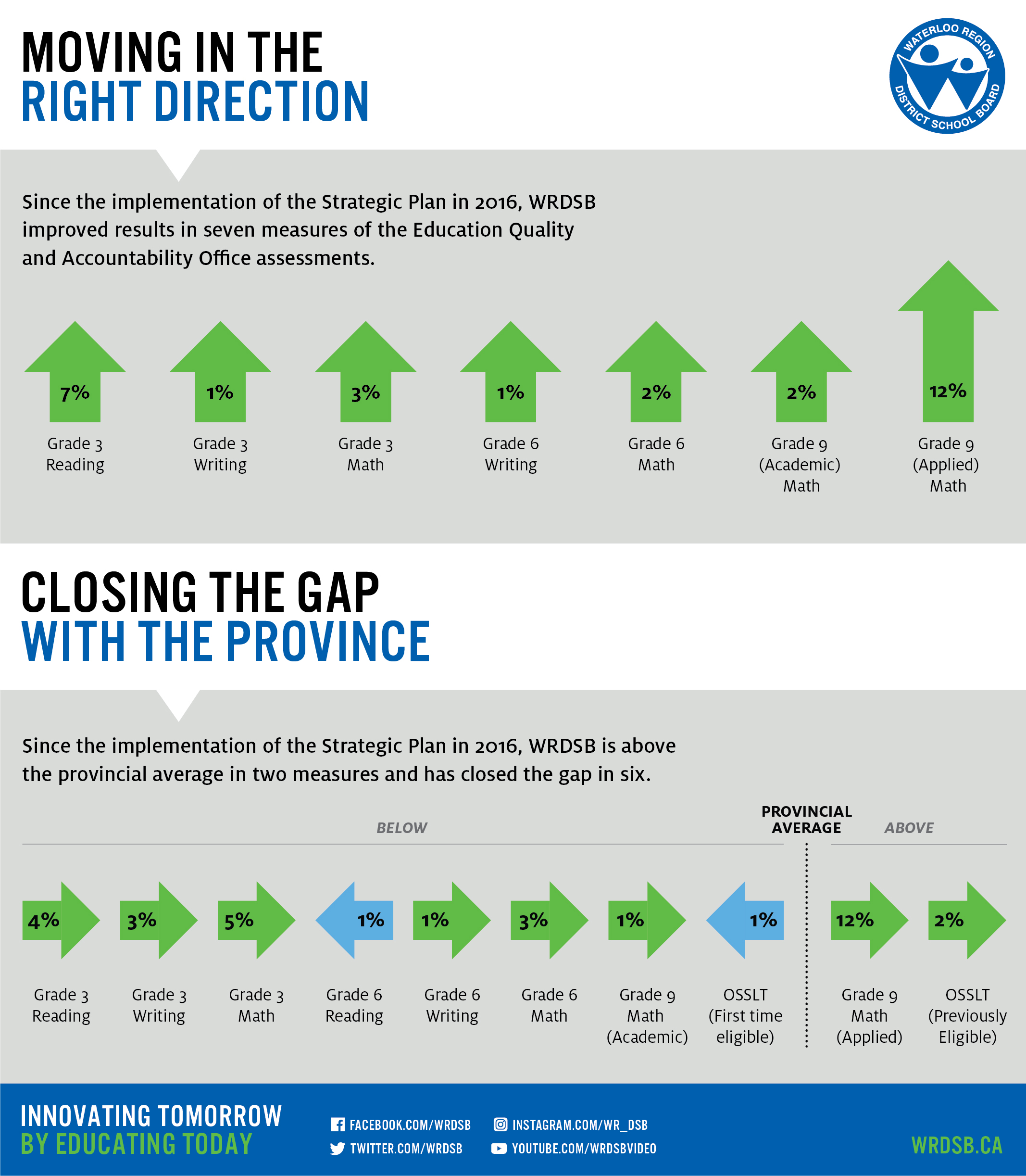 Since the implementation of the Strategic Plan in 2016, WRDSB has seen an increase in results each year. Results this year show an increase in six measures, closing the gap in six out of ten assessments.